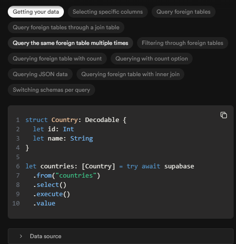 This reference documents every object and method available in Supabase's Swift library, supabase-swift. You can use supabase-swift to interact with your Postgres database, listen to database changes, invoke Deno Edge Functions, build login and user management functionality, and manage large files.