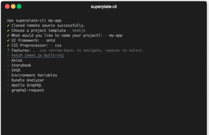 A well-structured production-ready frontend boilerplate with Typescript, React Testing Library, styled-component, React Query, .env, Axios, Bundle Analyzer, Prettier and 30+ plugins. superplate lets you start rock-solid, production-ready React, Next.JS and refine projects just in seconds. The command-line interface guides the user through setup and no additional build configurations are required.