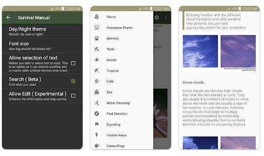 This is a survival manual/guide based on the public domain US Army Survival Field Manual FM 3-05.70 (FM 21-76). It is fully functional offline, which is important in the case of a catastrophe. But it doesn't have to be used only in emergency situations, it can also be useful for outdoor trips, walks, camps, and learning about nature and yourself truly. This is not only fun, but you can also train skills (fire, build shelter, ...) that you may need in a catastrophe. Some things work best with practice in a relaxed environment, so you also have time for some experiments. The refugees also are welcome to use this application to prepare and guide you for your dangerous journey. Although I hope that we as humans will come to feel and stop wars and end climate injustice so that people do not have to flee and be afraid.