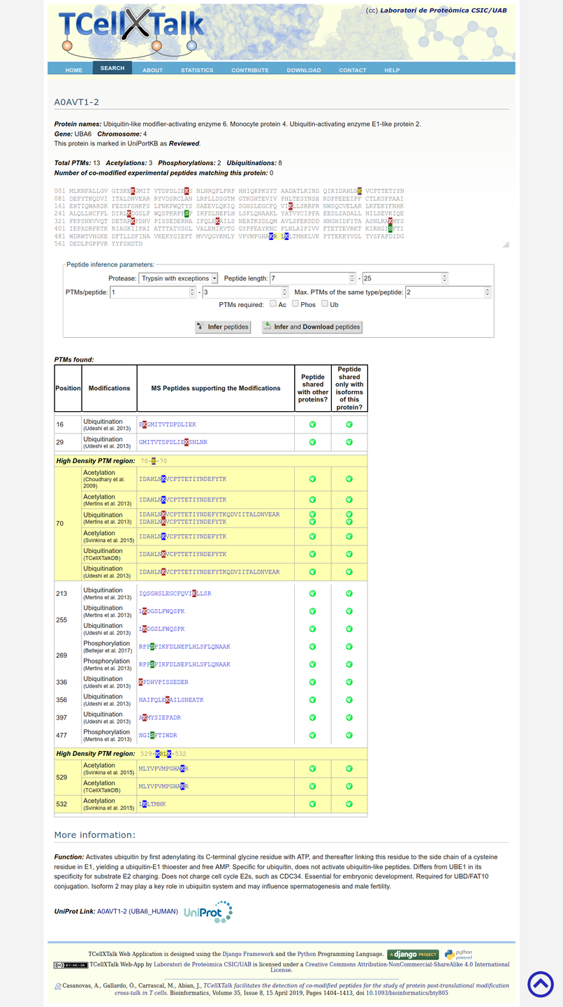 - Casanovas, A., Gallardo, Ó., Carrascal, M., Abian, J., TCellXTalk facilitates the detection of co-modified peptides for the study of protein post-translational modification cross-talk in T cells. Bioinformatics 2019, 35-8, 1404–1413, DOI 10.1093/bioinformatics/bty805 ( https://doi.org/10.1093/bioinformatics/bty805 )