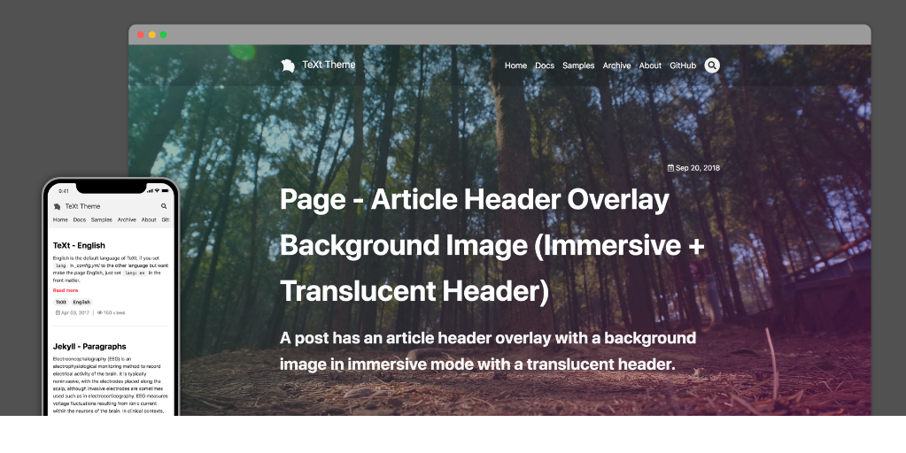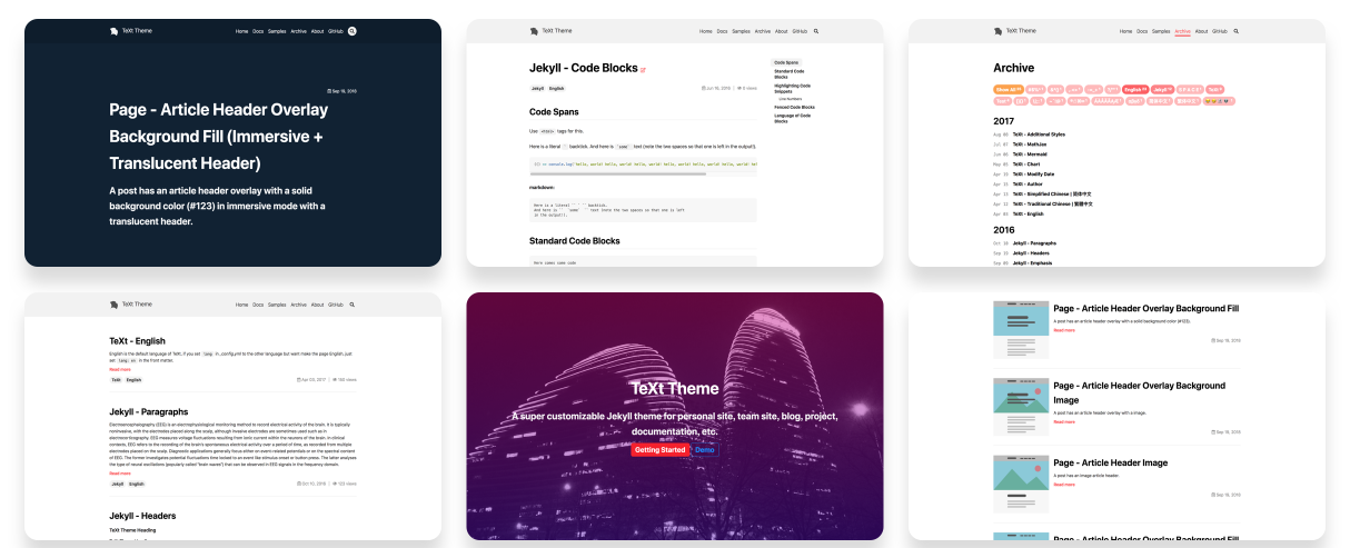 A super customizable Jekyll theme for a personal site, team site, blog, project, documentation, etc. TeXt is a super customizable Jekyll theme for a personal site, team site, blog, project, documentation, etc. Similar to the iOS 11 style, it has large and prominent titles, round buttons and cards.