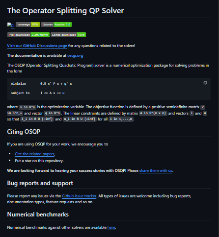 OSQP uses a specialized ADMM-based first-order method with custom sparse linear algebra routines that exploit structure in problem data. The algorithm is absolutely division-free after the setup and it requires no assumptions on problem data (the problem only needs to be convex). It just works. OSQP has an easy interface to generate customized embeddable C code with no memory manager required. OSQP supports many interfaces including C/C++, Fortran, Matlab, Python, R, Julia, Rust.
