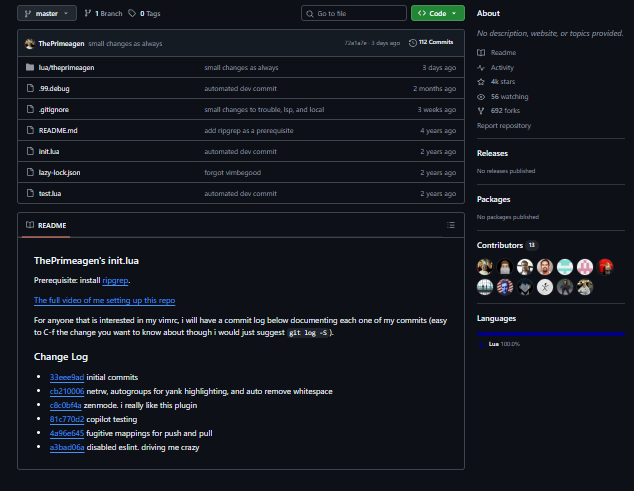 init.lua is the personal Neovim configuration repository managed by ThePrimeagen, showcasing his curated setup that optimizes Neovim for modern development workflows using Lua rather than the traditional Vimscript. It includes a thoughtfully assembled set of plugins, key mappings, autocommands, UI tweaks, and performance settings that reflect years of live-coding refinement and real world use. The configuration leverages popular ecosystem tools like lazy plugin managers, language server integrations, and custom enhancements to improve navigation, syntax highlighting, file management, and editor ergonomics. Users can clone and adapt this repository as a starting point for their own Neovim customization, taking advantage of presets that already incorporate best practices for productivity and code clarity. Because the repository captures a historical commit log with explanations of changes, readers can trace decisions and learn how different configuration elements interact.