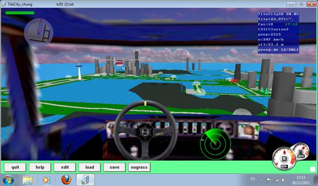 Tilecity chung is a free car in the city building game from an openb3d demo by Ogg ( added car / flight / tank simulator + edit , load , save map + cars traffic + gui windows + heightmaps + cars racing + houses + trees + grass + skydome + sounds + performances boost + shooting + boats + tanks + redlights + stops + lamps + heighmaps edit, save, load). It is written in compiled freebasic and uses openB3D (open source blitzmax b3d game engine for freebasic). Source code is included in the zip file.Can run on a small netbook with windows 7. Create a map file (text 64x64) and explore a 3D openGL town with sea, towers, roads, highways, dirtways, relief, trees, houses, grass, airports . Drive cars among the town traffic , start races against computer driven cars, take a flight by plane to the airport or follow the other flying around cessna, pilot a tank or shoot them down.