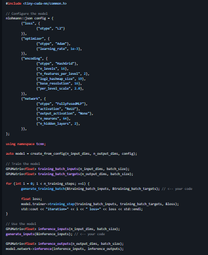 - Tiny CUDA neural networks have a simple C++/CUDA API