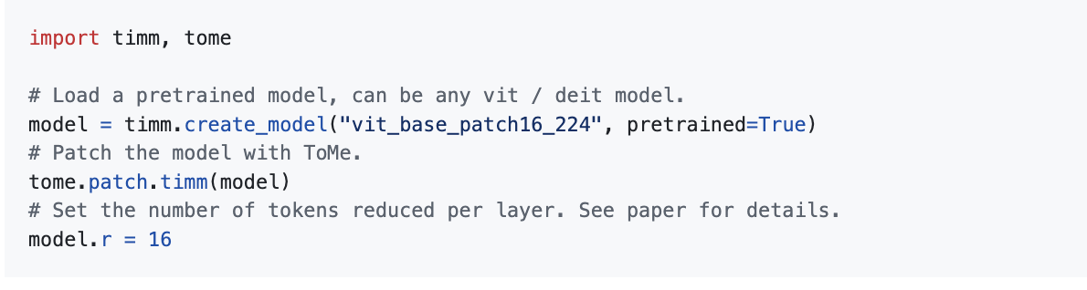 ToMe (Token Merging) is a PyTorch-based optimization framework designed to significantly accelerate Vision Transformer (ViT) architectures without retraining. Developed by researchers at Facebook (Meta AI), ToMe introduces an efficient technique that merges similar tokens within transformer layers, reducing redundant computation while preserving model accuracy. This approach differs from token pruning, which removes background tokens entirely; instead, ToMe merges tokens based on feature similarity, allowing it to compress both foreground and background information efficiently. ToMe integrates seamlessly into existing transformer models such as DeiT, MAE, SWAG, and timm ViTs, offering 2–3x speedups during inference and substantial efficiency gains during training. The method can be applied dynamically at inference time or incorporated into training for improved performance.