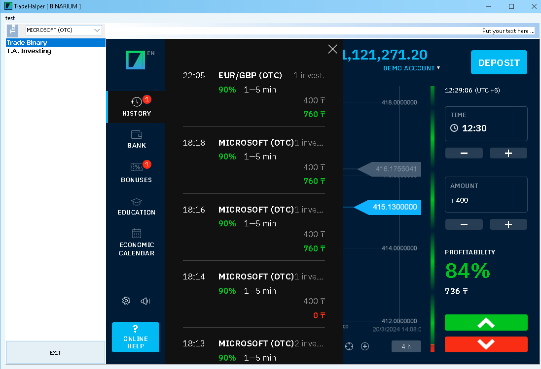 Binarium is a trading platform that offers binary options trading on various assets. The program provides tools for fundamental and technical analysis, aided by artificial intelligence to enhance trading decisions. With educational materials and a user-friendly interface, it's accessible for both beginners and experienced traders aiming to increase their profit.