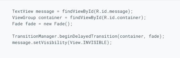 Originally this library was a full backport of Android Platform's Transitions API. Then all the bug fixes from the library were ported into AndroidX Transitions (previously Support library). Now this lib has minSdk version 14 (Android 4.0 ICS) and consists of some transitions which are not a part of the official set. Internal Transitions that was marked as @hide in the platform are recolor, rotate, change text and crossfade. As well as two extra transitions, which are scale and translation. Migrate to AndroidX! Support libraries are not updating anymore, to get all the bug fixes you have to use AndroidX transitions. Replace imports for all the classes which are a part of the AndroidX lib. Some setters in AndroidX transitions are not following the builder pattern, please rewrite this usages with introducing a helper variable if you encounter the issue.