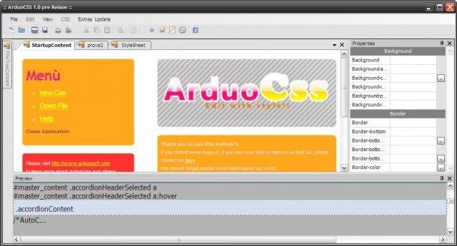 ArduoCSS is a Css editor with an intuitive and easy-to-use interface.With ArduoCSS you can preview dinamically how html is affected by your stylesheet changes. Most commons css properties can be choosed by drop-down menu, reducing the typing mistakes.