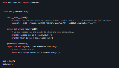 A fully asynchronous Python IRC, API, EventSub and PubSub library for Twitch. Full asynchronous design. Covers 100% of the Twitch API. IRC Commands extension for creating powerful chatbots. EventSub and PubSub support. Helper extensions for Music/Sounds and Background Tasks. Object-orientated design with stateful objects. TwitchIO is an asynchronous Python wrapper around the Twitch API and IRC, with a powerful command extension for creating Twitch Chat Bots. TwitchIO covers almost all of the new Twitch API and features support for commands, PubSub, Webhooks, and EventSub.