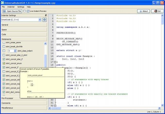 A cross platform GUI for several code formatter, beautifier and indenter like AStyle, GNU Indent, GreatCode, HTML Tidy, Uncrustify and many more. Main feature is a live preview to directly see how the selected formatting option affects the source code.