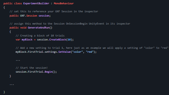 The Unity Experiment Framework (UXF) is an open-source package for the Unity3D game engine that can be used to assist the development of virtual reality human behavior experiments. Developed by Jack Brookes, Immersive Cognition Group, University of Leeds. Automates the process of collecting the variables you define within your task, and stores them simple CSV files. Time-series data such as the position and rotation of an object can be easily acquired and split into one file per trial. Allows you to programmatically define independent variables for your session, blocks and trials. Includes a pre-built UI for allowing the researcher to view and enter information about the session. All file IO tasks are performed concurrently in a separate thread to avoid any drops in the framerate. UXF works with any Unity project but is designed specifically for virtual reality human behavior experiments.