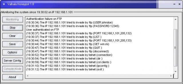 Valhala Honeypot is an easy to use honeypot for the Windows System. The software have the following services: http (web), ftp, tftp, finger, pop3, smtp, echo, daytime, telnet and port forwarding. Some services are real, others are a simulation.