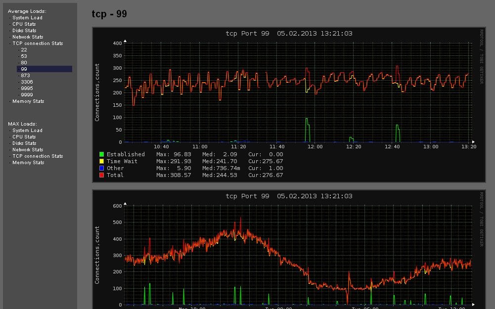 vstats is tool for monitoring Linux System usage like CPU, Disks, Network and Memory. It stores collected data in rrd files and draw graphs via web server.