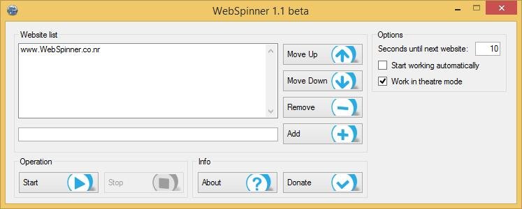 WebSpinner is a tiny new tool that automatically changes the websites in your browser according to a predetermined time period. All you need to do is insert as many websites as you want and the time period (in seconds), and press a button! WebSpinner can be used for a lot of cool things such as: notification boards, advertisement, online galleries and more... Check it out, it's 100% FREE!