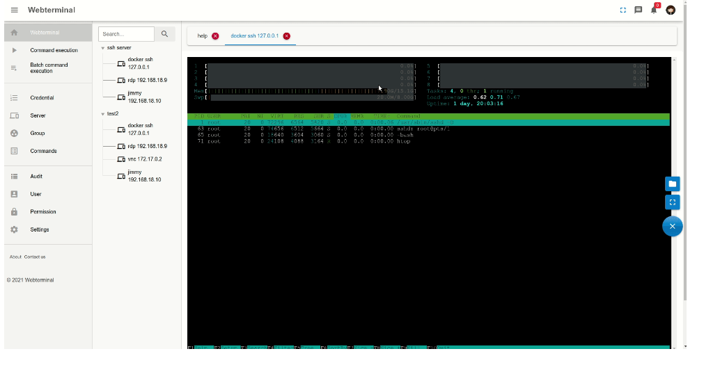 Webterminal implemented by django. This project focus on DevOps and Continuous Delivery. For now it supports almost 90% of remote management protocols such as vnc, ssh, RDP, telnet, sftp... It supports the possibility to monitor and record user actions when users use this project to manage their server! You can also replay the user action such as a video. Hope you enjoy it. Webterminal helper support (use your favorite tools to manage and connect server) VNC, RDP, SFTP Remote file browser (download, delete, update and upload files). Ubuntu webterminal helper support. Mac webterminal helper support. Windows webterminal helper support. Commercial version provides mstsc helper.