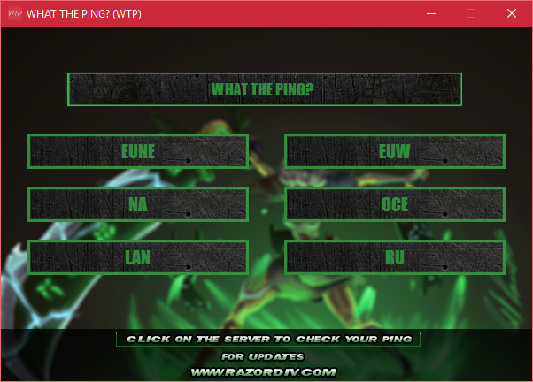 WTP can check your ping on servers such as EUNE/EUW/NA/RU and more! with just a click! i made WTP using Python Language and its process is to ping the League of Legends servers,by that way it can find your ping in game.Download the file WTP 1.3.rar!