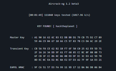 - If the password is cracked you will see a KEY FOUND! message in the terminal followed by the plain text version of the network password