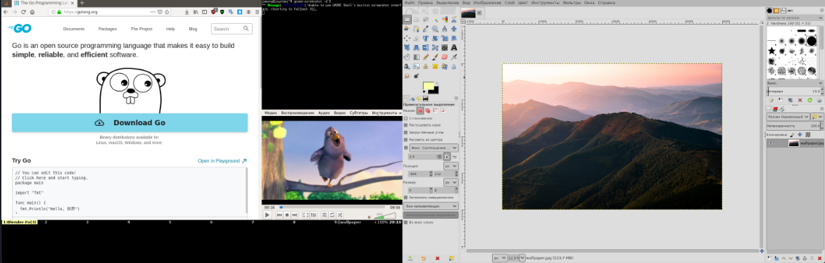 wmwm is a pure Go auto tiling window manager for X11. It is very simple (2k loc) and lightweight. With wmwm you start with one window which takes full size of the screen. Next window will split screen into equal columns with the second window placed in the right column. Additional windows will be placed in the right column. Windows in a column always have the same height. You can move windows within the column or from one column to another. Windows and columns belong to workspaces. In wmwm you have eight workspaces (nine if external monitor is connected). You can easily move windows from one workspace to another.