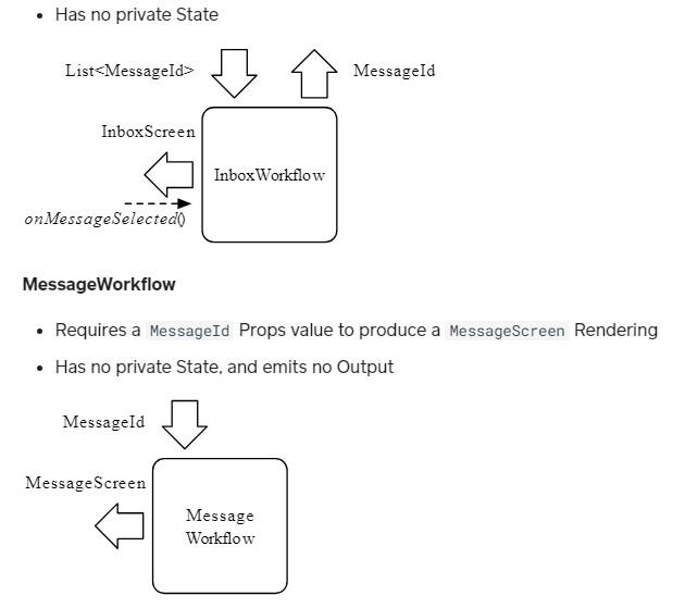 Workflow is an application framework that provides architectural primitives. A corresponding testing framework that facilitates simple-to-write unit tests for all application business logic and helps ensure correctness. Corresponding UI frameworks that bind Rendering data classes for “views” (including event callbacks) to Mobile UI frameworks for Android and iOS. Optimized for composability and scalability of features and screens. A library that supports writing business logic and complex UI navigation logic as state machines, thereby enabling confident reasoning about the state and validation of correctness. A unidirectional data flow library that uses immutable data within each Workflow. Data flows in a single direction from the source to the UI, and events in a single direction from the UI to the business logic. Each logical component area is separated into a Workflow with a finite set of states and the logic to transition between them.