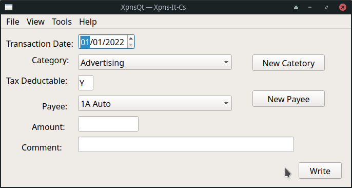 Expense tracking utility which allows user to enter expenses with comments and place them into user defined categories. When done you can generate a report grouping tax deductible expenses by category showing details and total. This is meant as an aid to tax preparation. The author has been using some version of this every tax filing season.