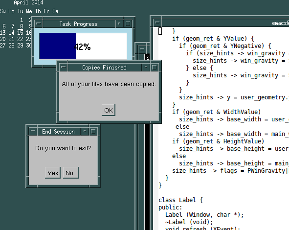Xshell widgets are convenient popup windows that you can use with shell commands and scripts. The package includes a message box widget, a yes/no dialog, a text entry box, and a progress bar. The widgets use the X Window System Xlib calls and are easy to install and use with a minimum of extra libraries. The Xshell widgets are free software and written in C++ for Linux and UNIX systems.