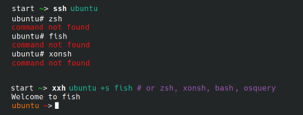 You stuffed the command shell with aliases, tools and colors but you lose it all when using ssh. The mission of xxh is to bring your favorite shell wherever you go through ssh without root access and system installations. Preparing portable shells and plugins occurs locally and then xxh uploads the result to the host. No installations or root access on the host is required. Security and host environment are a prime focus. No blindfold copying config files from local to the remote host. Following privacy and repeatability practices the best way is to fork the xxh plugin or shell example and pack your configs into it. Every xxh repo could be forked, customized, and reused without waiting for a package management system, xxh release, or any third-party packages. Five shells are currently supported and more could be added by the community.