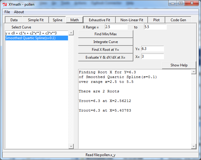 After fitting, XYmath will find roots, minima, maxima, derivatives or integrals of the curve. It will generate source code that documents and evaluates the fit in python, FORTRAN or EXCEL.