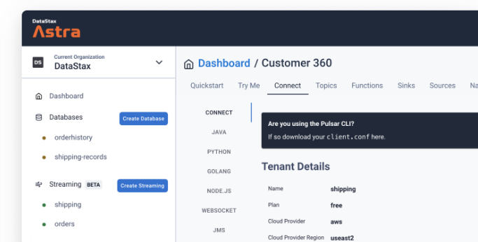 Responsive applications keep users engaged and developers inspired. Rise to meet these ever-increasing expectations with the DataStax Astra Streaming service platform. DataStax Astra Streaming is a cloud-native messaging and event streaming platform powered by Apache Pulsar. Astra Streaming allows you to build streaming applications on top of an elastically scalable, multi-cloud messaging and event streaming platform. Astra Streaming is powered by Apache Pulsar, the next-generation event streaming platform which provides a unified solution for streaming, queuing, pub/sub, and stream processing. Astra Streaming is a natural complement to Astra DB. Using Astra Streaming, existing Astra DB users can easily build real-time data pipelines into and out of their Astra DB instances. With Astra Streaming, avoid vendor lock-in and deploy on any of the major public clouds (AWS, GCP, Azure) compatible with open-source Apache Pulsar.