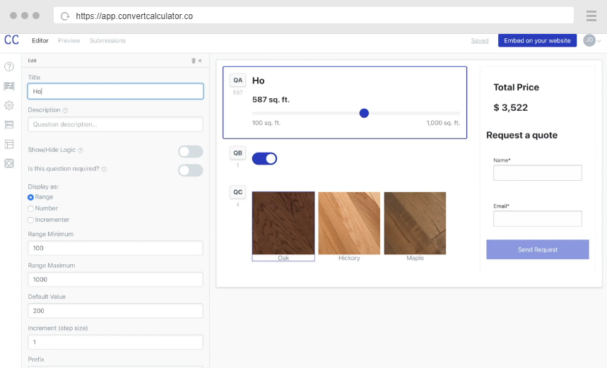 Turn your spreadsheet into a website calculator form and boost your business! Let your website visitors turn the knobs and calculate their price, ROI, or savings. Create custom calculator forms and pages entirely by yourself, that would take a team of developers weeks to build. Calculators simplify complex numbers. And help you explain your pricing, features or return-on-investment to your audience. Increase your online conversion with a website calculator form, and instantly capture more leads, sales and customers. Easily create a page or embed your form on your website. Your calculator can be embedded on any website and we have custom embed methods for popular platforms. A DIY drag and drop calculator form builder that includes all the question types you need. Create advanced formulas in a simple way with our formula builder. All Excel formulas are available out of the box. And create variables to reuse formulas or create datasheets to calculate with large tables of data.