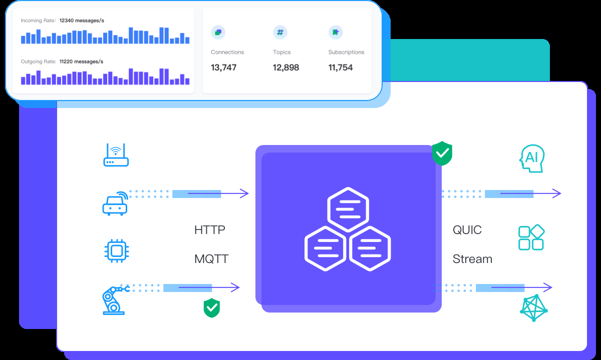 EMQX is the world's most scalable and reliable MQTT messaging platform designed by EMQ. It supports 100M concurrent IoT device connections per cluster while maintaining extremely high throughput and sub-millisecond latency.