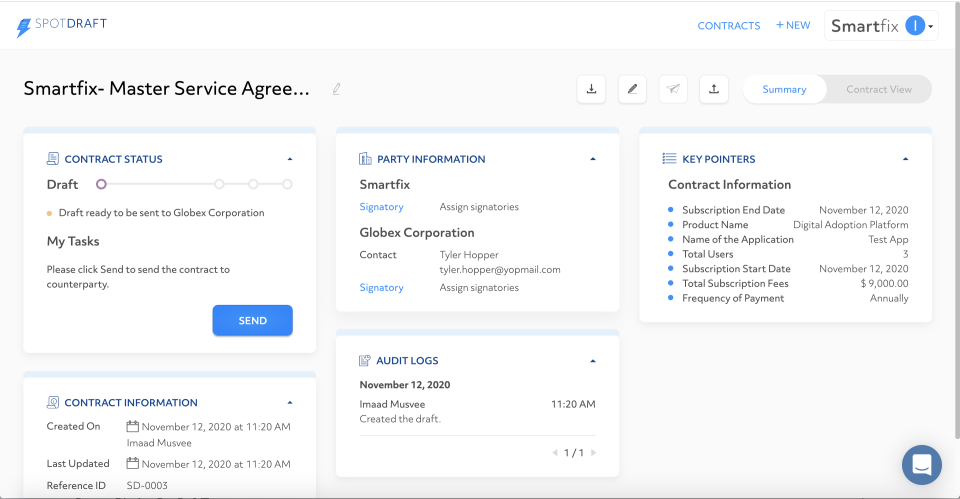 SpotDraft is an end-to-end contract automation platform that helps organizations draft, review and manage contracts seamlessly. Modern legal teams are leveraging the SpotDraft platform to reduce their contract turnaround times by up to 90%. With SpotDraft, business teams automate multiple time-consuming processes across a contract lifecycle so they can focus on what truly matters - growing their business. At SpotDraft we are building revolutionary tools to help businesses make their contracts "come to life" and take the pain out of paperwork management. Contracts govern some of the most important business relationships. But businesses spend hours on drafting and negotiating contracts, and toggling back and forth for invoices and reminders. Through SpotDraft's intuitive AI powered platform, our customers today draft and sign contracts, and send automated reminders. SpotDraft helps you put your business on autopilot.