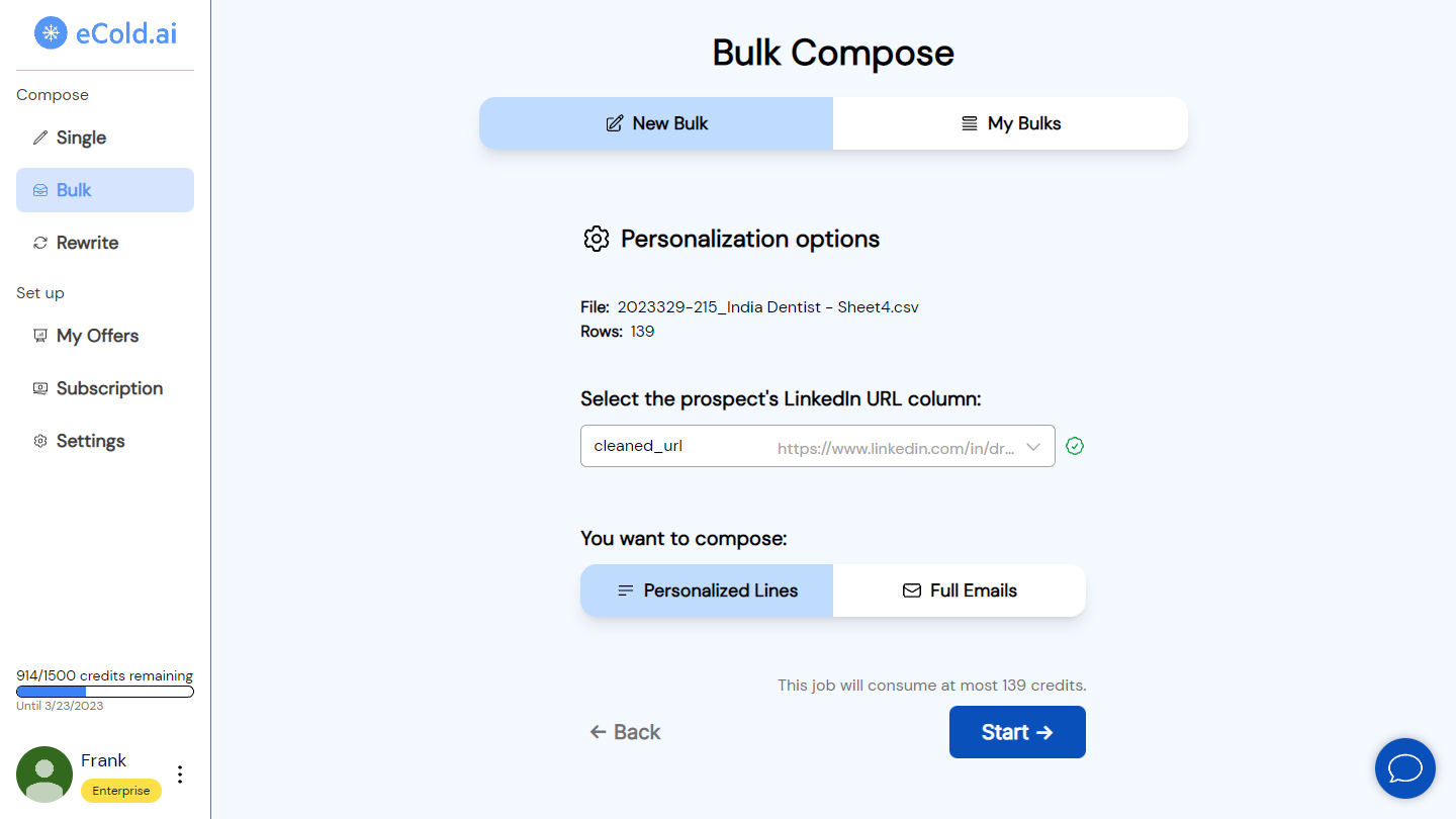 Your emails will stand out as they will be tailored specifically to each of your prospects. eCold.ai is 40X times faster than a human. Managing to generate 100s of lines in seconds. Without having to rely on humans, your scalability issues are gone. eCold.ai automatically retrieves information from your prospect’s LinkedIn to ensure the highest personalization quality. eCold.ai was built with ease of use in mind. With only a few clicks you'll be able to generate as much personalized lines as you need. eCold.ai is 6X cheaper than hiring a VA. While also not needing training on how to do its job. After a couple seconds, download your updated CSV file with your personalized lines crafted uniquely for each prospect.