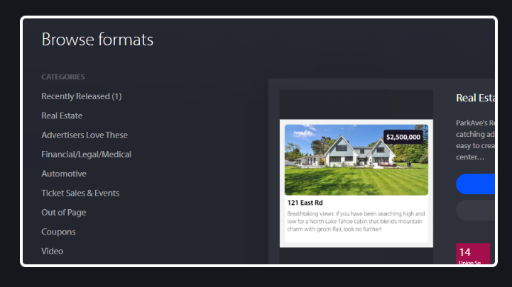 Built for digital advertising salespeople. High impact and low cost display advertising that will impress your clients and boost renewals. Impress your local advertising prospects with something new and different. It's worked for hundreds of local news publications and can work for you too. ParkAve is an ad creation platform that our customers use to create ads from a library of ad formats. ParkAve does not collect personally identifiable information as part of the ad creation process. It does not sell or share customer data or visitor data. ParkAve brings Broadstreet's famous plug and play, high impact ad formats to any ad manager, including: Google Ad Manager, Advanced Ads for Wordpress, AdRotate, Smart Adserver, Adzerk, TownNews, and many more.