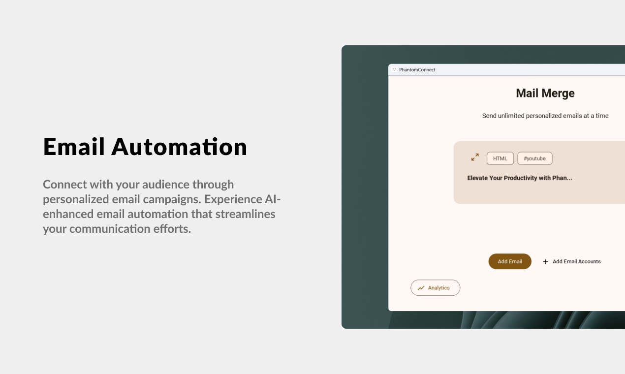 PhantomConnect is a desktop automation tool that streamlines repetitive online tasks across platforms like LinkedIn, Instagram, and Facebook. Using prebuilt "Phantoms," users can automate outreach, engagement, and more. With integrated AI and GPT-powered features, PhantomConnect enables smarter workflows, personalized messaging, and greater efficiency — helping users scale their online presence without complex setups.