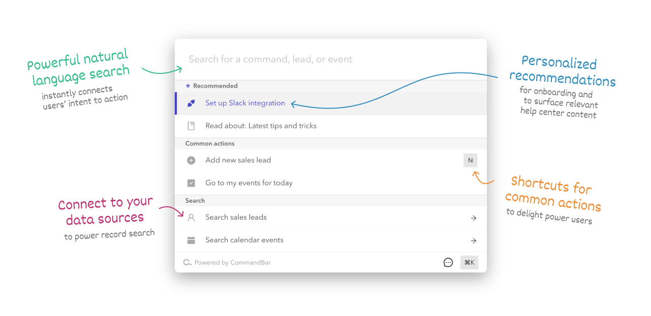 CommandBar will make your app easier to learn, so new users will convert better and require less onboarding. And once they become regular users, they'll have an easier time finding features and using your app, generating fewer support requests. Power users will love CommandBar, since it'll let them speed through common workflows. A cmd+k interface puts all your app's functionality into a single, searchable UI. Copy a code snippet, set up commands with our low-code Editor, then deploy. The Editor makes it really fast to prototype and ship, so you can easily add a new command without needing to find an engineer to build it for you. CommandBar is optimized for every major desktop browser, operating system, and web technology. CommandBar is optimized for performance: every interaction feels instantaneous. It'll give your users that new-computer-everything-feels-faster feeling.