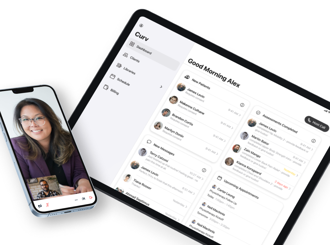 Curv Health is a SOC2 secure platform with video calling, messaging, billing, scheduling, charting, & at-home program prescription built into a single app available on your iPad and coming soon to web & iPhone.