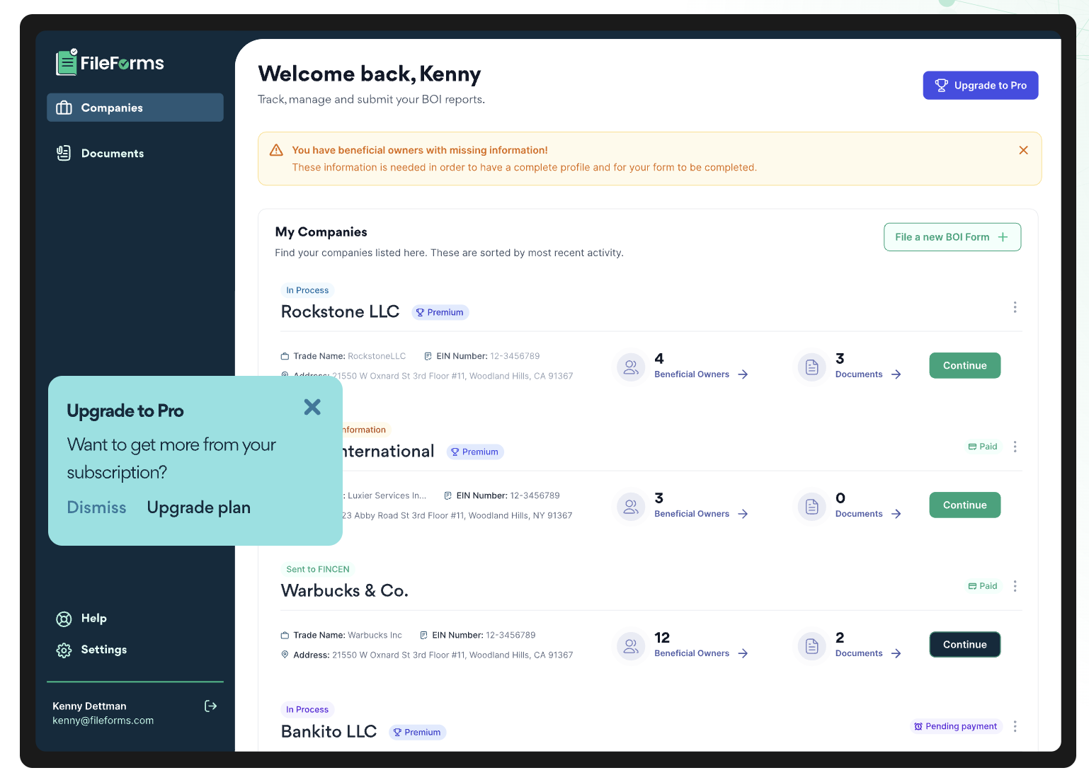 Save time on BOI compliance with an online filing and information management solution that guides you step-by-step through the filing process.