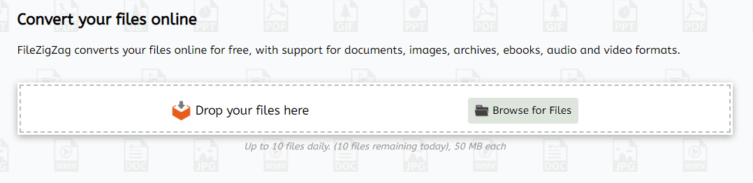 FileZigZag is a free online converter that supports a wide range of formats including audio, video, image, document, ebook, and archive. It uses a sophisticated conversion engine to deliver the best quality conversion. Also, you don't need to install any software in your computer. FileZigZag converts your files online for free, with support for documents, images, archives, ebooks, audio and video formats. FileZigZag supports conversion between a wide variety of different file formats. We work hard to add new conversion formats. Contact us if you would like to add a new format and we will do our best to add it. Click on a source format link to open a converter for that format, or click on a target format link to open a source-to-target converter. Our servers has industry-leading CPUs, so your can save your CPU power and let us do the work for you. We use sophisticated conversion algorithms specially designed to provide the best quality possible.