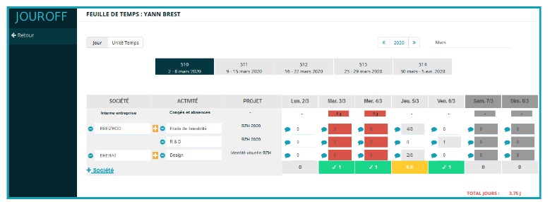JOUROFF is an online time management and project monitoring software adaptable to all areas of activity. We manage both working time and time tracking by activity or project. The JOUROFF time management software is an HR portal made up of several working time management modules. As an online time-tracking tool, the software offers an intuitive process that allows small and medium-sized businesses, to pool working time management (HR) and activity monitoring. Indeed, the time monitoring module is intended for companies that have administrative management needs for leave and absences, but also needs in terms of activity management. In the latter case, the time management software allows each company to feed a repository of activities in order to ensure time monitoring by activity. This approach called intuitive time management allows the entry of working times via a single point of entry, namely the timesheet.