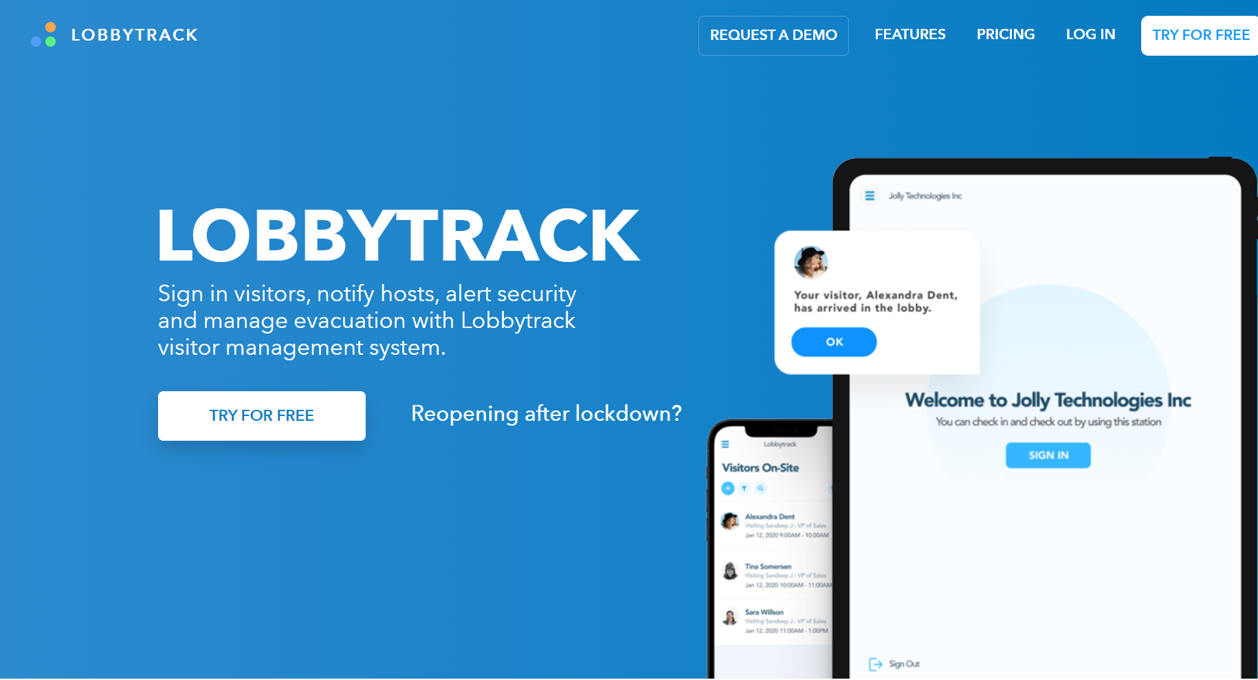 Lobbytrack is the best visitor management system (ViMS) for contactless visitor management. You can quickly sign in and out visitors using the visitor sign-in system and visitor management app (iOS, Android and Windows Tablet).