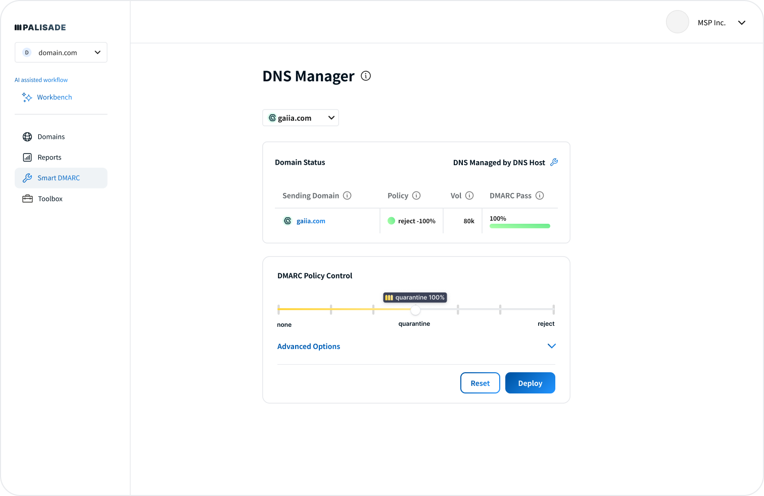 Palisade is designed for any organization seeking to enhance email security and DMARC compliance, as well as Managed Service Providers (MSPs) and organizations managing multiple domains. Our tool empowers teams to save time, reduce costs, and boost email deliverability while safeguarding domains from spoofing and phishing. It’s the ideal fast, easy, and scalable solution for managing email security across clients or internal systems.