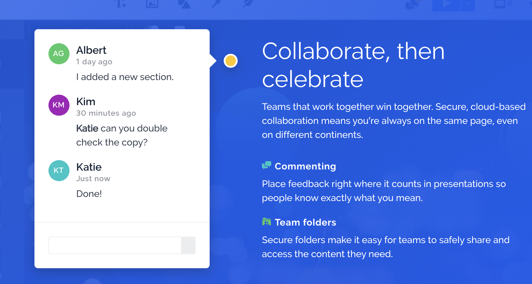 It has a collaboration feature that allows you to work with other people on the same online presentation. You can invite others to edit, comment, or view your presentation in real time. You can also share your presentation with anyone via a link or embed it on a website or blog.