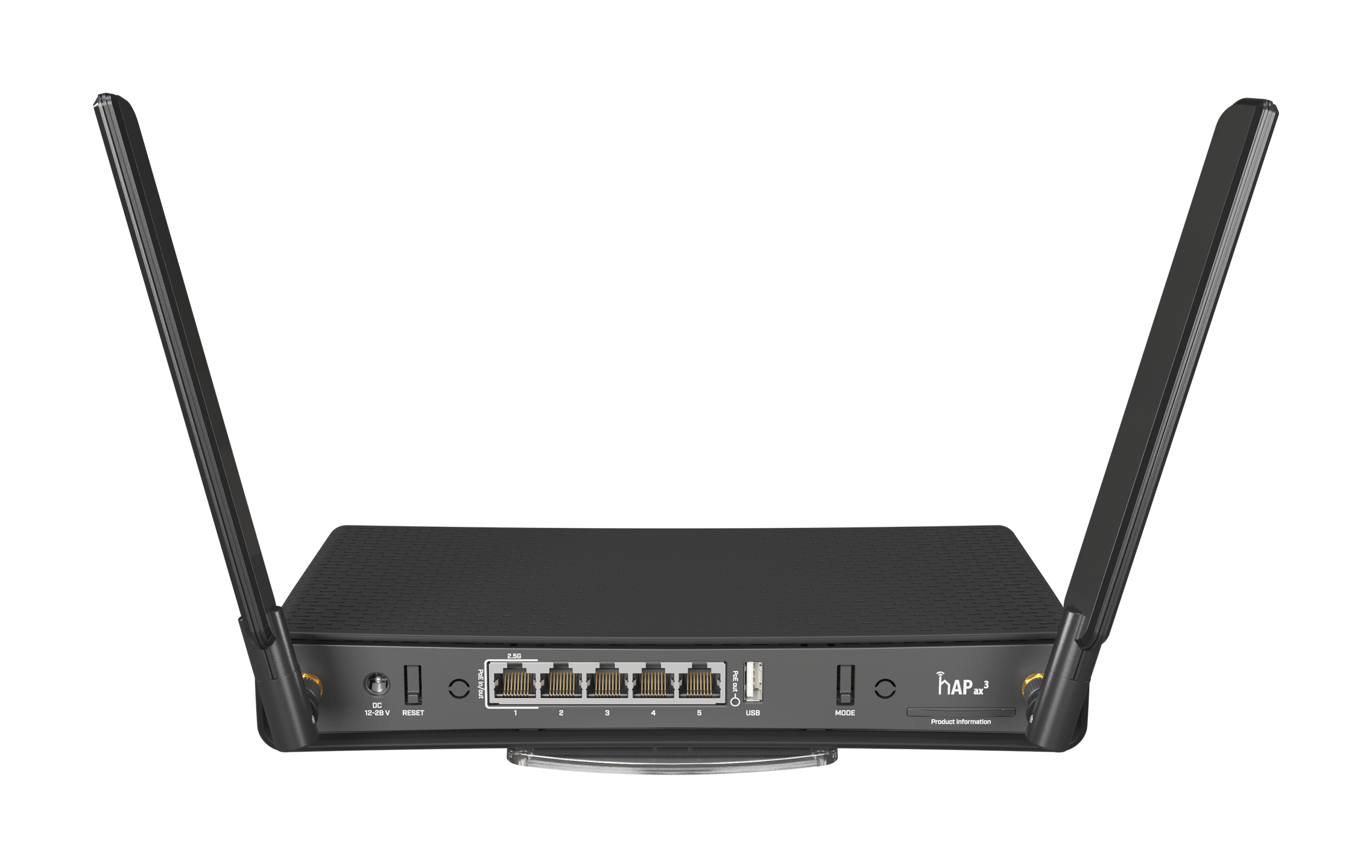 hAP ax³ is our most powerful AX device with the best wireless network coverage so far. It features a modern quad-core ARM CPU running at 1.8 GHz and enough memory (1GB RAM + 128 MB NAND) for most tasks. Complex firewall rules, IPsec hardware encryption, Wireguard, BGP, advanced routing, or multiple remote work VPN tunnels won’t stop your family from comfortable browsing, streaming, gaming, and so on. There’s enough processing power for everyone. And we’ve added a speedy USB 3 port for all your storage purposes or an additional LTE modem. Depending on your overall setup, our AX product family offers up to 40% higher speed in the 5 GHz and up to 90% higher speed in the 2.4 GHz spectrum! Potent external antennas allow reaching gain up to 5.5 dBi, so you can forget about Wi-Fi Boosters and other tricks. Smooth and fast connectivity for your whole apartment – that’s just how hAP ax³ works. Home network speeds are getting serious.